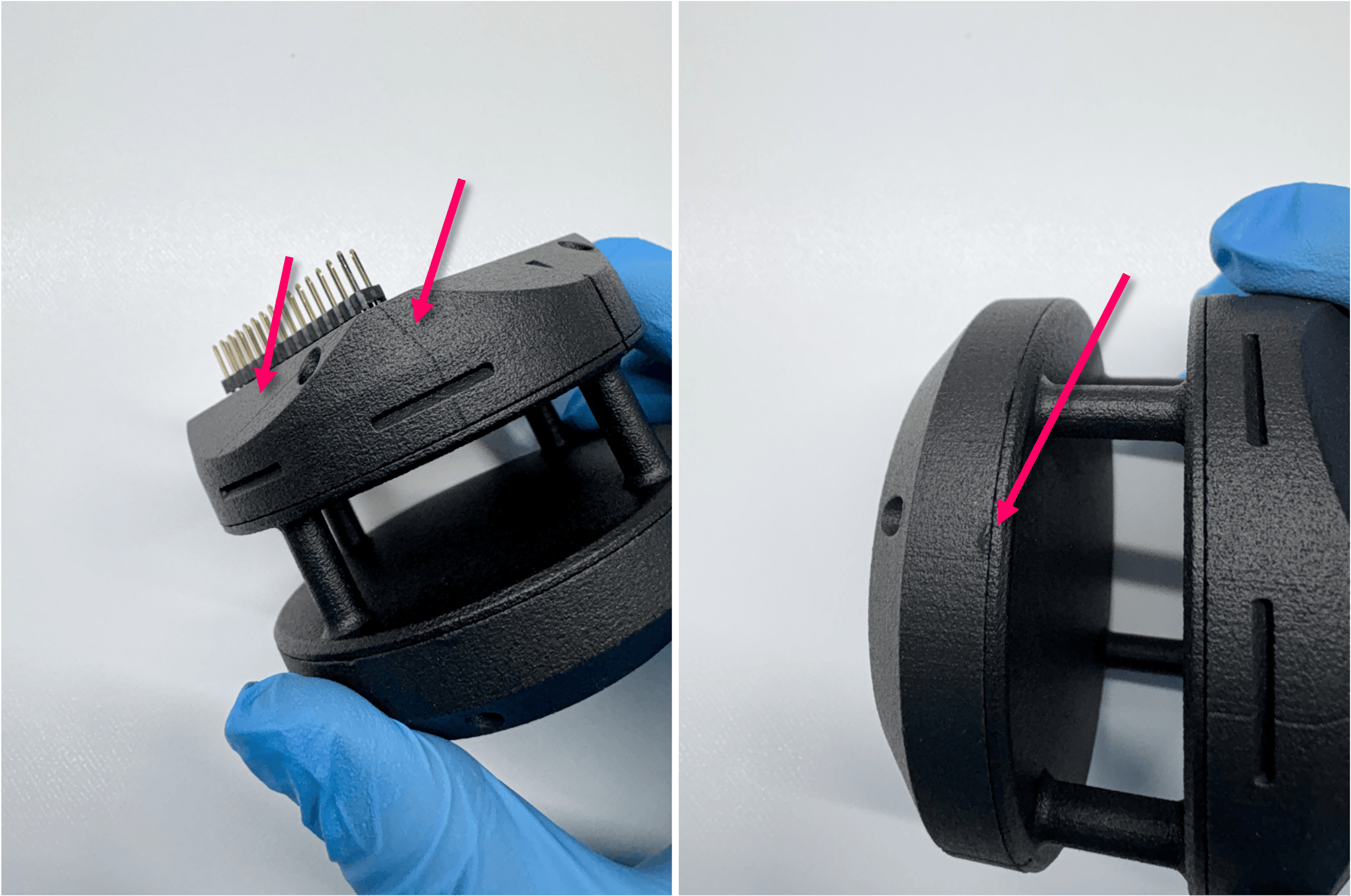 積層不良(痕または線)は筐体表面のみに生じており、亀裂等内部への問題はなく、
